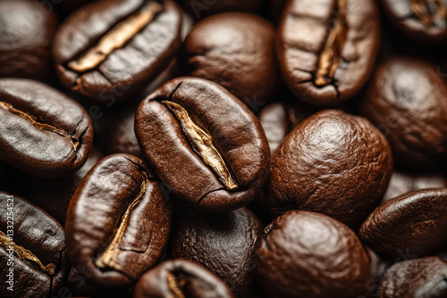 Naklejka premium Coffee beans scattered on rustic wooden table with morning sunlight casting...