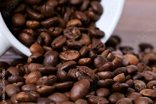 © IULIIA GUSEVA, Naklejka premium Coffee beans spill out of a white cup onto a wooden table. Coffee beans on a wooden background. Close-up