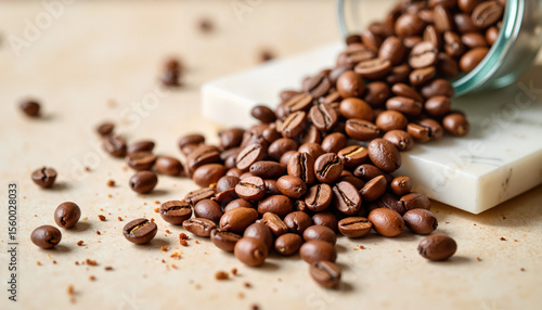 © Светлана Иванькова, Naklejka premium Coffee beans spilling from jar onto marble surface