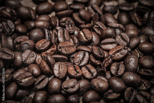 © strannik_fox, Obraz premium Coffee beans texture for background. Selective focus. Toned