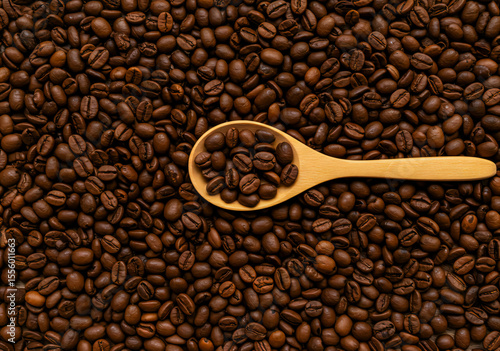 Obraz premium Coffee Beans Texture with Wooden Spoon
