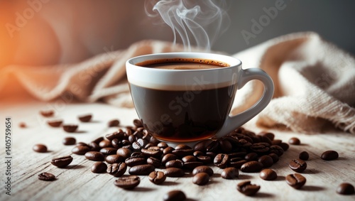 © AbstractAI, Fototapeta premium Coffee cup alongside coffee beans on a tabletop