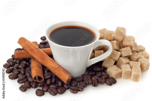 Fototapeta premium Coffee cup and beans with sugar and cinnamon on white background