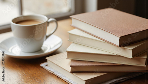 Fototapeta premium Coffee cup beside stacked books on wooden table