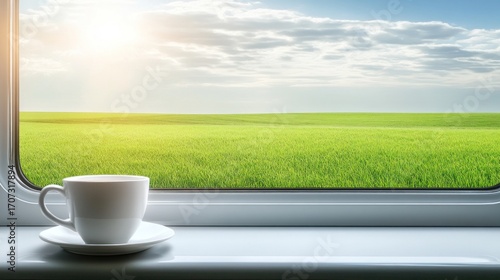 © wikkie, Obraz premium Coffee cup by window with green fields