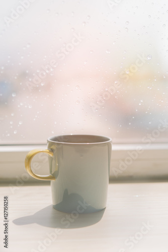 Fototapeta premium Coffee cup on table with rain drop on window background,retro e
