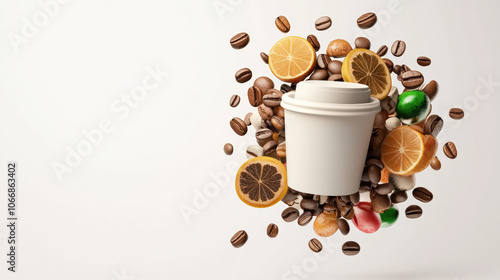 © Arumboy, Obraz premium coffee cup surrounded by coffee beans and citrus fruits, creating vibrant scene