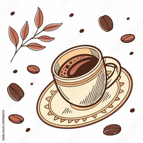 Obraz premium Coffee Cup With Beans And Leaves In Sketch Style Illustration