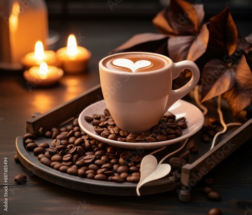 Fototapeta premium Coffee cup with heart shape on the table with coffee beans and candles....