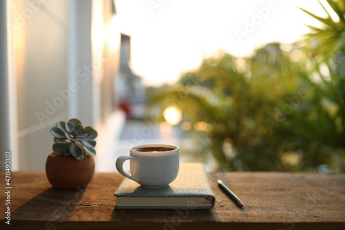 Obraz premium Coffee cup with small plant pot and notebook on wooden table under sunlight