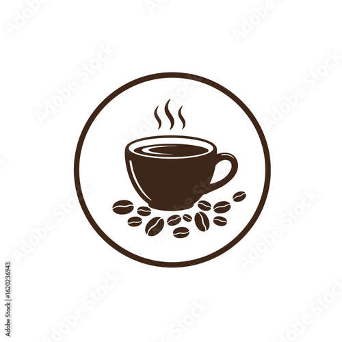 © val_webart, Fototapeta premium Coffee cup with steaming drink and coffee beans in a circular design