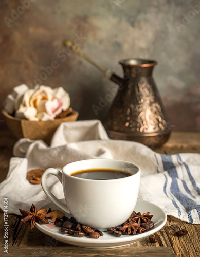 © Pendaki, Fototapeta premium Coffee cup with Turkish coffee pot and sweets