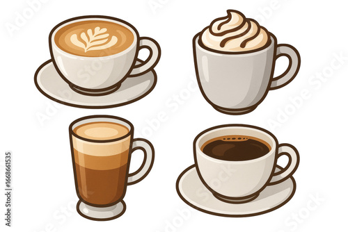 Obraz premium Coffee cups featuring latte, cappuccino, macchiato, and espresso arranged against transparent backdrop, displaying classic cafe drinks