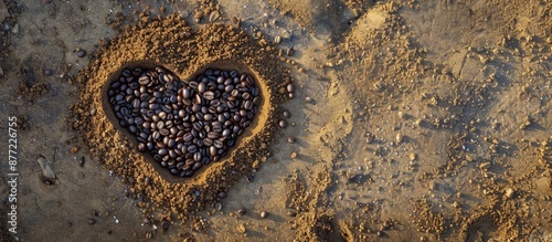 Obraz premium Coffee grains in heart shape on sandy surface expressing love for coffee...