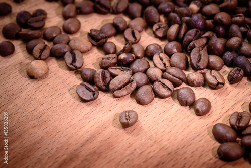 © kulkann, Naklejka premium coffee grains on grunge wooden background