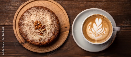 Fototapeta premium Coffee in a cup and a delicious cake placed on a wooden table