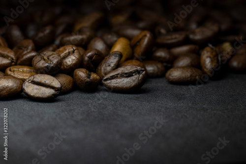 © Okwildlifephoto , Naklejka premium Coffee in beans on dark background. Abstract background texture.Coffee beans texture. Food background of coffee beans