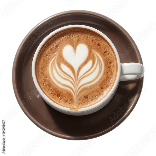 © thienhuong, Obraz premium Coffee Latte Art in White Mug on Brown Plate, transparent background