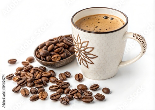 Fototapeta premium Coffee Mug and Grinded Coffee Beans Concept Photography Isolated on White...