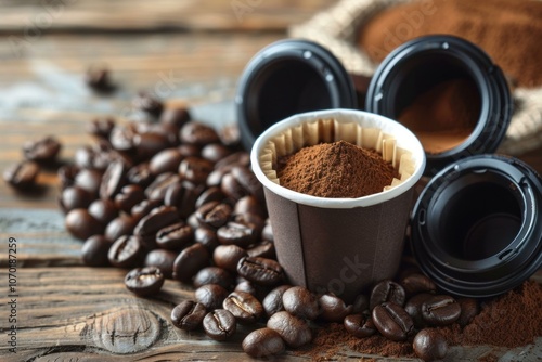 © juliars, Fototapeta premium Coffee paper pods, ground coffee, roasted beans and capsules on rustic wooden table