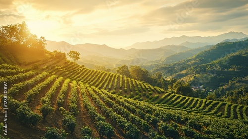 © wicha, Naklejka premium coffee plantation nestled in the mountains, with rows of coffee plants thriving under the warm sun,