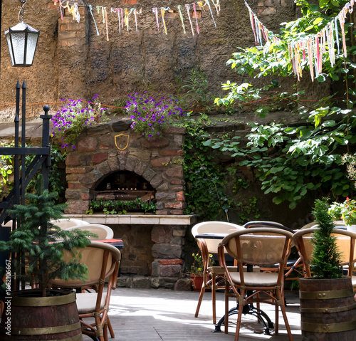 © sergei_fish13, Obraz premium Coffee shop in mediaeval district of old European town