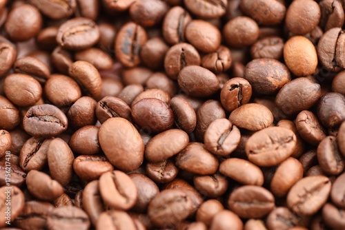 © mehaniq41, Naklejka premium Coffee texture roasted beans from above soft light close up