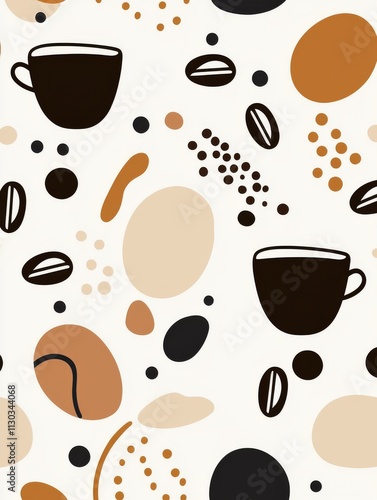 © Nipa, Obraz premium Coffee-themed abstract pattern featuring cups and beans.