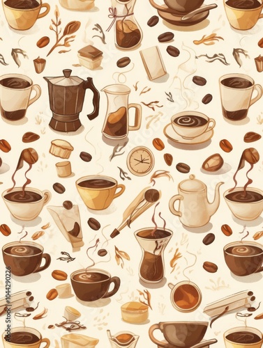 Obraz premium Coffee-Themed Vector Pattern for Kitchen Towel Featuring Vintage Coffee Pot, Mugs, and Beans in Earthy Tones