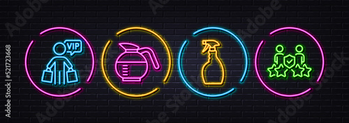 Naklejka premium Coffeepot, Vip shopping and Spray minimal line icons. Neon laser 3d lights. Security agency icons. For web, application, printing. Brewed coffee, Exclusive privilege, Washing cleanser. Vector