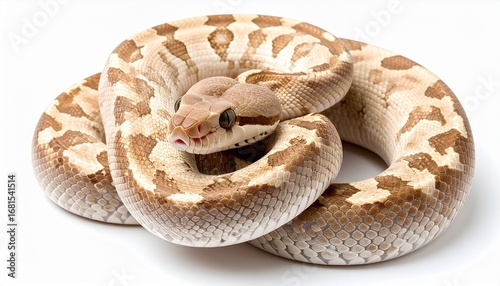 Obraz premium Coiled beige snake with brown markings, smooth glossy scales, head slightly raised, on white background