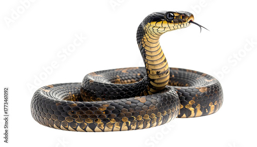 Naklejka premium Coiled black and yellow snake with forked tongue out