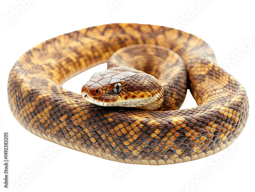 © Sawitree, Obraz premium Coiled brown snake with detailed scales and alert eyes on transparency background