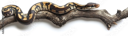 © Monchisa, Obraz premium Coiled Elegance, a ball python gracefully entwined around a branch, showcasing its intricate scales against a minimalist white backdrop, emphasizing its natural beauty.