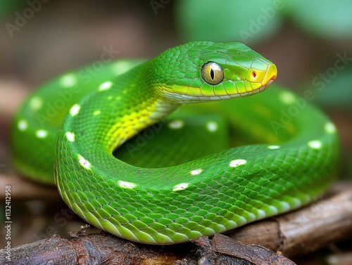 © ntpscl, Fototapeta premium Coiled grace a green vine snake in tropical forest wildlife photography