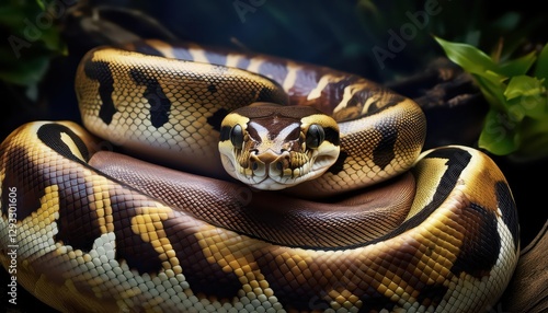 © netsay, Obraz premium Coiled Mystery The Enchanting Ball Python, Showcasing Striking Patterns and Rich Scales in an Eerily Beautiful Forest Ambiance, Evoking a Sense of Awe and Wonder.