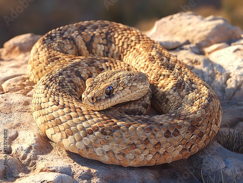 © mh, Naklejka premium Coiled Rattlesnake Resting on Rocks with Detailed Scale Pattern