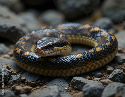 Fototapeta premium Coiled Reptile Resting on Rocky Ground with Scaly Pattern