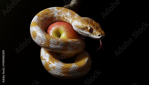 © Rattanachai, Obraz premium Coiled Serpent Around Red Fruit On Dark Background