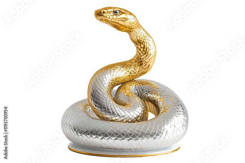 Fototapeta premium Coiled silver and golden snake sculpture with detailed scales isolated on...