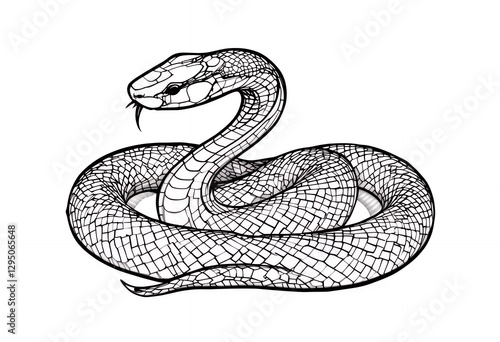 Fototapeta premium Coiled Snake Illustration with Tongue Darting Out in Black and White