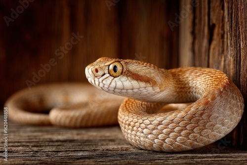 © ChaoticMind, Fototapeta premium Coiled snake resting on wooden surface in natural habitat during daylight