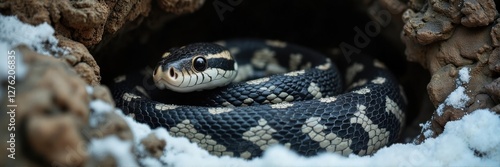 © Krasavina Alena, Fototapeta premium Coiled snake resting quietly in snowy burrow background