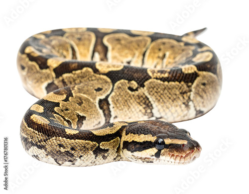 © Cah, Obraz premium Coiled snake with brown & beige patterned scales, head turned slightly forward, against a black background