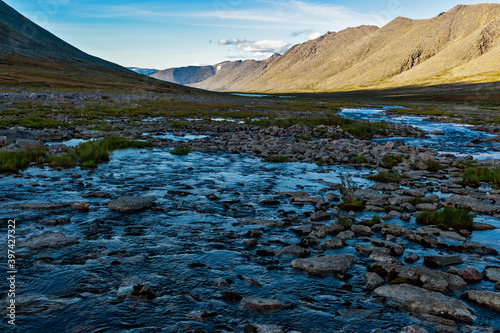 © Alx_Yago, Obraz premium cold stream and mountain range on a summer day