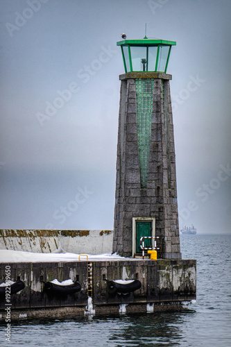 © Maryna Konoplytska, Fototapeta premium Cold winter weather in Europe. Lighthouse and pier in Gdynia
