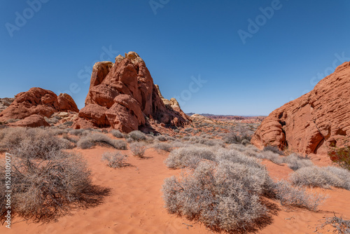 Fototapeta premium Coleogyne ramosissima or blackbrush, is a low lying, dark grayish-green, aromatic, spiny, perennial, soft wooded shrub, Rainbow Vista Trail, Valley of Fire State Park, Clark County, Nevada