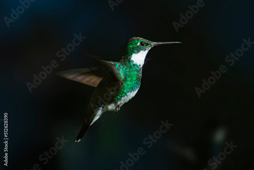 Fototapeta premium Colibrí garganta blanca volando sobre fondo oscuro