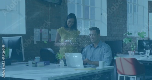 Obraz premium Collaborating colleagues discussing reports in open-plan office, with laptop...