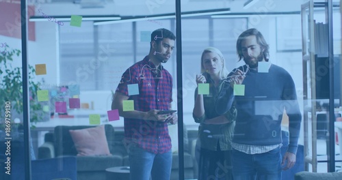 © vectorfusionart, Fototapeta premium Collaborating team reviewing sticky notes and marker sketches on glass wall at lounge, with tablet